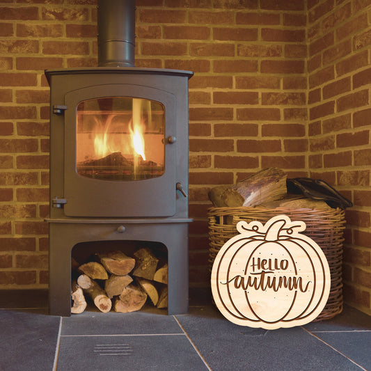 Hello Autumn - Wooden Pumpkin Plaque/Sign For Fall - Cosy Aesthetic, Autumnal Vibes, Subtle, Minimal, Rustic, Modern Halloween Home Decor