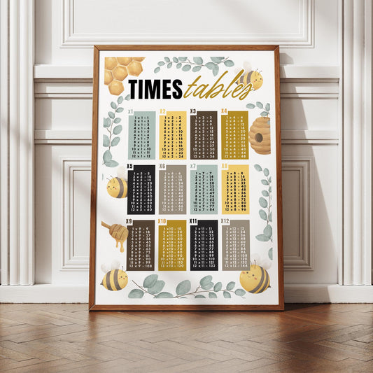 Bee-Themed Times Tables Poster: Educational Math Print For Kids, Multiplication Wall Art for Classrooms, Playrooms, or Bedroom Decor