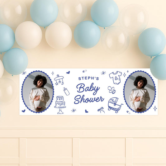 Personalised Baby Shower Banner | Baby Shower Doodles Banner | Custom Name & 12 Photos | Playful Line Art | Blue coquette Party backdrop