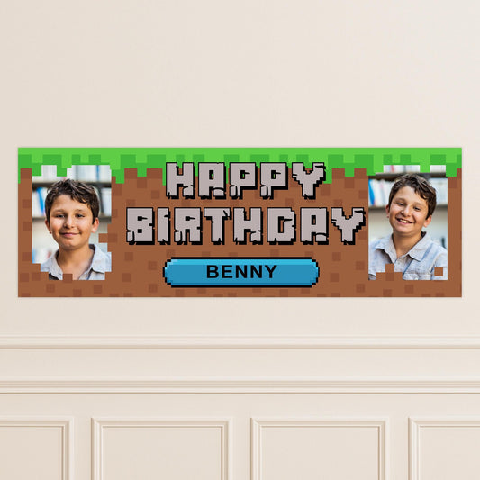 Personalised Birthday Banner - Block Game | Custom Name & Photo | Game Inspired Banner | Pixel Game | Gamer Birthday Party decor for kids