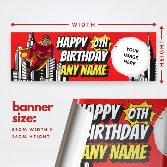 Personalised Superhero Birthday Banner with Photo Custom Party Decoration for Kids, Red & Yellow Comic Style, Birthday Banner for Boys