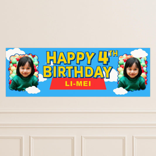 Personalised Birthday Banner - Toy Land | Custom Name & Photo | Toy-Inspired Banner | Colourful Cartoon Style Birthday Party Decor for Kids