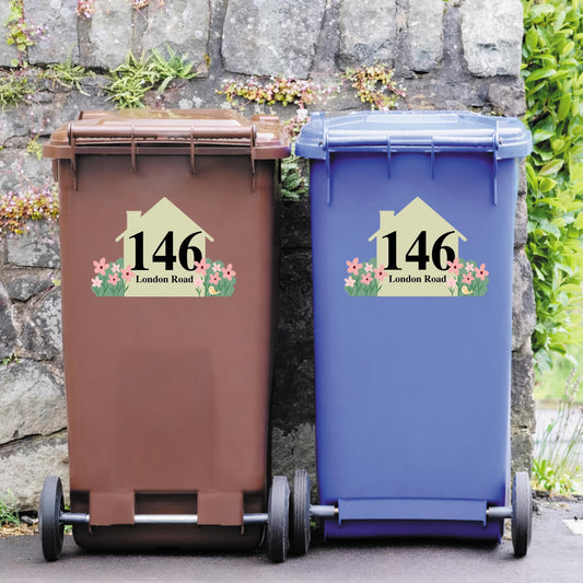 Personalised Wheelie Bin Sticker | Custom House Number & Street Name Bin Decal | Floral House Address Sticker | Wheelie Bin Label