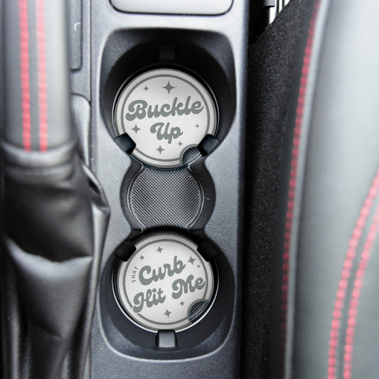 Hit Curbs Car Coaster Set: Buckle Up Cup Holder Drinks Mat, Girly Car Accessory, Car Lover, Bad Driver Gift, Cute Gift For Her