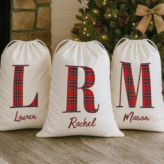 Personalised Christmas Present Sack with Tartan Monogram Custom Initial & Name Gift Bag Santa Sack