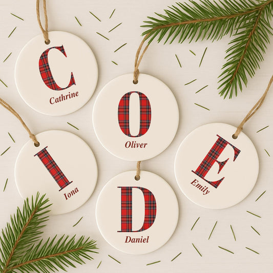 Personalised Tartan Monogram Christmas Bauble Name & Initial Ceramic Ornament | Custom Tree Decoration