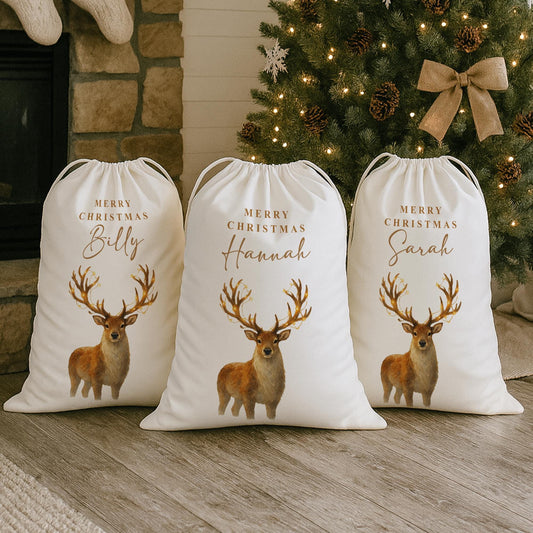 Personalised Christmas Present Sack Custom Name Rustic Watercolour Reindeer Christmas Gift Bag