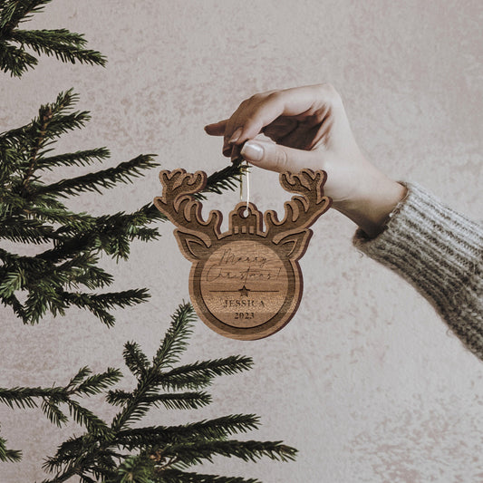 Personalised Reindeer Antlers Christmas Ornament - Custom Name, Rustic Xmas Christmas Tree Decor, Wooden Reindeer Bauble Decoration