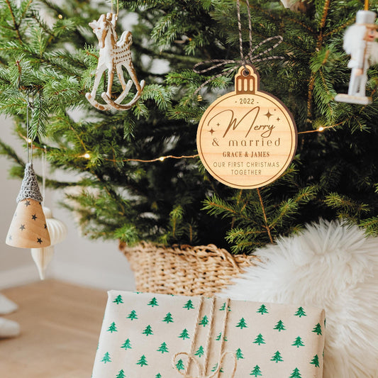 Merry & Married Bauble - Personalised Christmas Ornament For Newly Wed Couples, Xmas Keepsake Memento, Christmas Baubal, First Christmas
