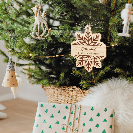 First Christmas Snowflake Ornament - Personalised 1st Xmas Wooden Bauble, Cosy Christmas Hanging Baby's Name First Christmas Tree Decoration