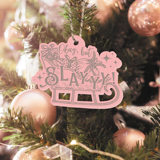 Slayyy Acrylic Ornament - Engraved Pink Acrylic Bauble, Funny Sassy Sleigh Pun Christmas Tree Decoration, Slay Queen Camp Girly Xmas Gift