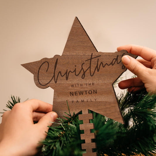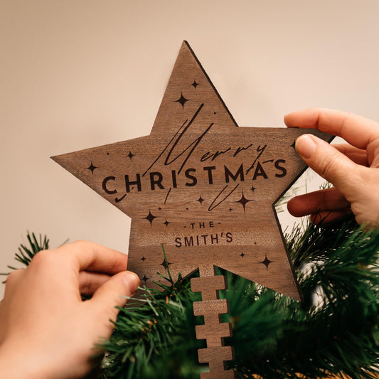 Tree Topper Star - Moontime: Personalised Christmas Tree Decor, Custom Family Name Decoration, Rustic Wooden Ornament, Xmas Keepsake