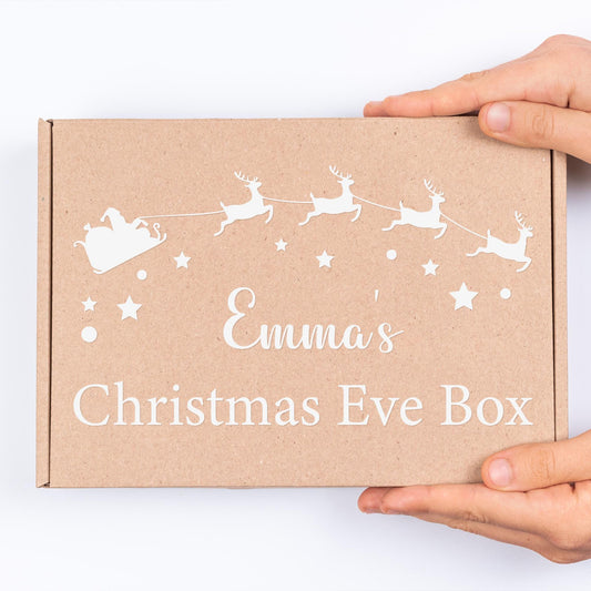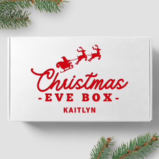 Personalised Christmas Eve Box Sticker: Custom Name Gift Box Decal, Christmas Eve Gift Idea, Xmas Gift Box Label Sleigh & Reindeer Design