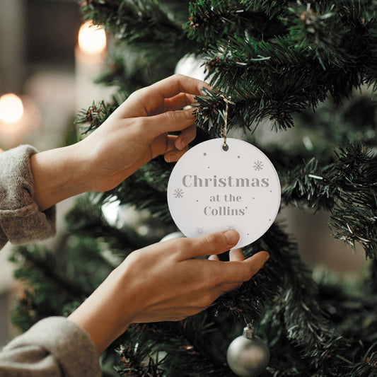 Christmas At The Personalised Family Name Bauble - Custom Name White Acrylic Keepsake Ornament, Clean & Minimal Aesthetic Xmas Home Decor