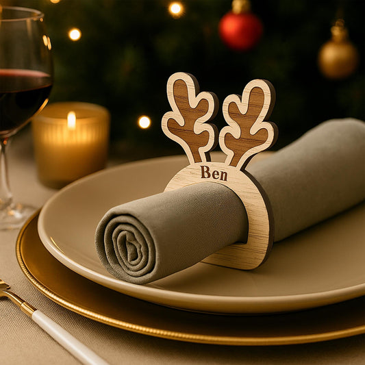 Personalised Wooden Reindeer Antler Napkin Ring Engraved Name Place Setting, Rustic Christmas Table Decoration, Festive Wooden Tableware