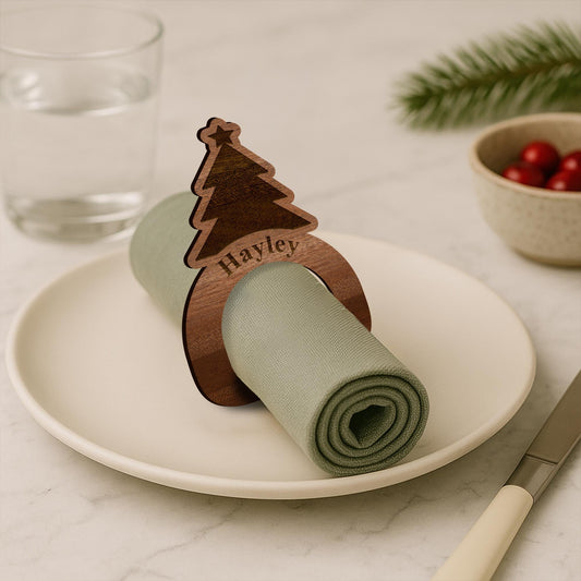 Personalised Wooden Christmas Tree Napkin Ring Engraved Name Place Setting, Rustic Festive Table Decoration, Wooden Christmas Tableware