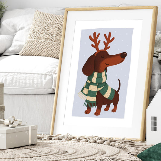 Christmas Dog Wall Art Sausage Dog with Reindeer Antlers Dog Lover Festive Xmas Print Dachshund Christmas Poster Seasonal Home Decor
