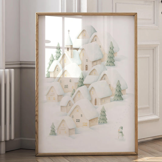 Christmas Village Wall Art 01: Snowy Winter Scene Print Cosy Neutral Christmas Illustration Poster Xmas Decoration Seasonal Home Decor