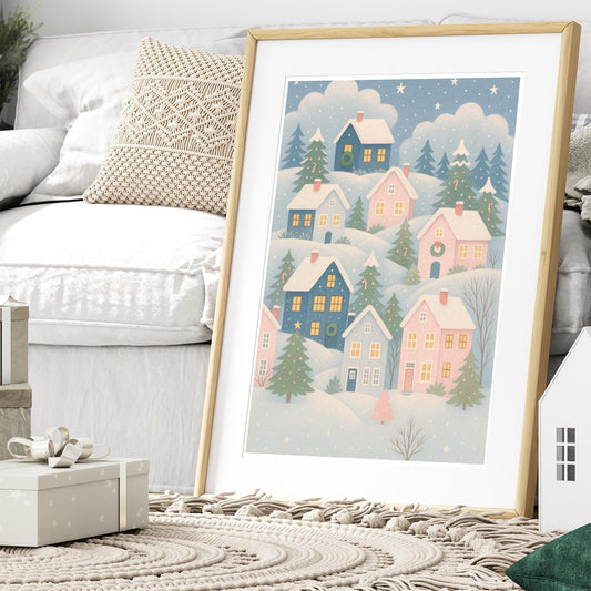 Christmas Village Print 02: Pastel Cosy Xmas Houses Wall Art Christmas Illustration Poster Seasonal Home Decor