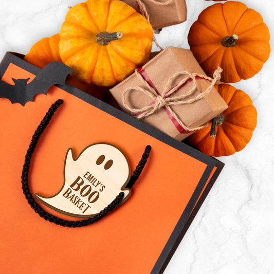 Personalised Halloween Gift Name Tag - Custom Wooden Boo Basket Tag, Reusable Halloween Basket Gift Label, Ghost or Pumpkin Design