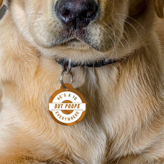 He's A 10 But Poops Everywhere, Personalised Dog ID Collar Tag: Funny Custom Pet Accessories, New Pet Essentials, Circle Text Design