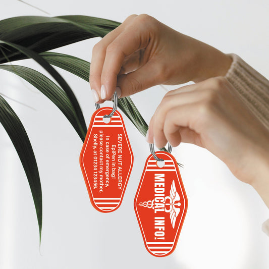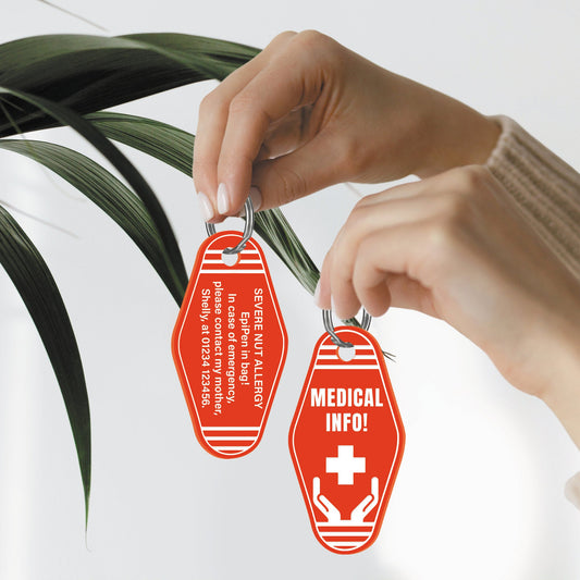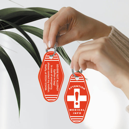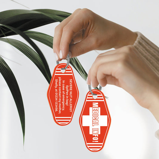 Medical Info Keyring - Retro: Personalised Medical Information Acrylic Keyring, Custom Safety Keychain, Emergency Contact, Alert
