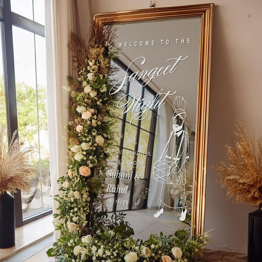 Sangeet Night Script Welcome Sign: Wedding Mirror Sticker | Personalised Vinyl Decal for Indian Weddings | Custom Bride & Groom Sign