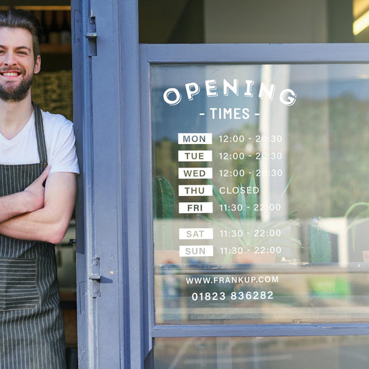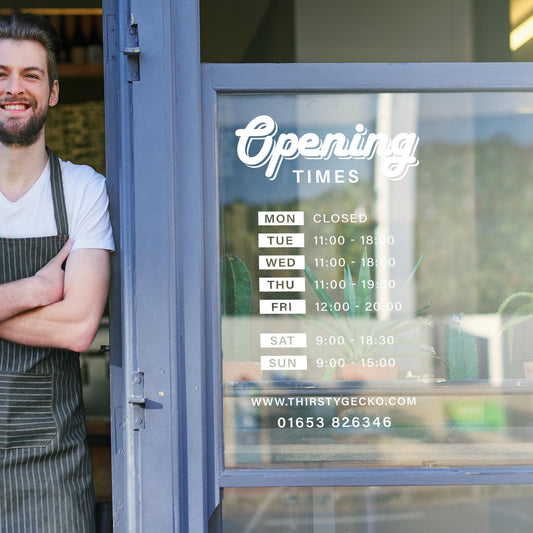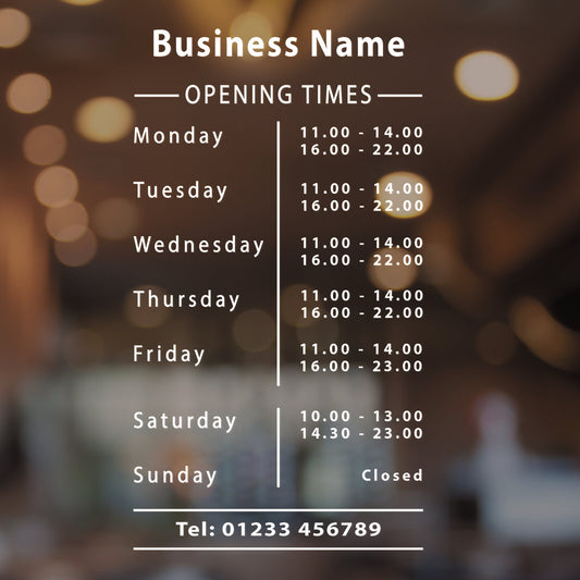 Opening Times Custom Shop Window Sticker - Personalised with Times, Name & Phone - Decal For Cafe, Pub, Bar or Shop Windows - Split Times