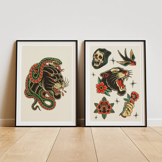 Traditional Tattoo - Panther Poster: Tattoo Flash Sheet Art Poster, Vintage Designs, Classic Ink-Inspired Wall Decor, Alternative Home Decor