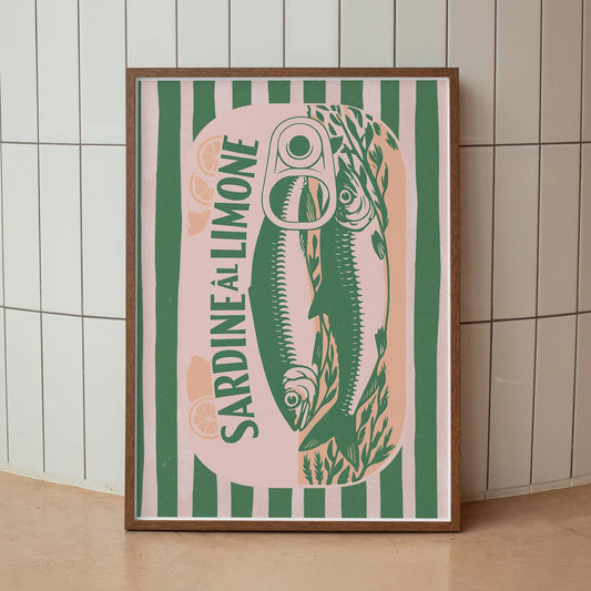 Sardine Tin - Green & Pink Print: Sardine al Limone Poster Retro Sardine Tin Wall Art Mediterranean Kitchen Decor Vintage Aesthetic