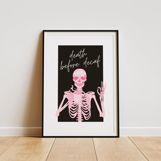 Death Before Decaf - 02 Poster: Dark Humour Print, Coffee Lover Gift, Spooky Season Kitchen Wall Art, Autumnal Vibes, Edgy Home Decor