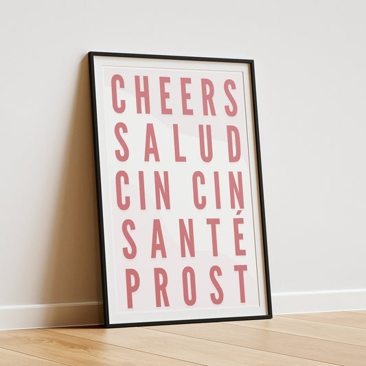 Cheers - Pink Typography Print: Cool Language Quote Wall Art, Toast Poster, Modern Home Decor, Typography Print, Home Bar or Kitchen Decor