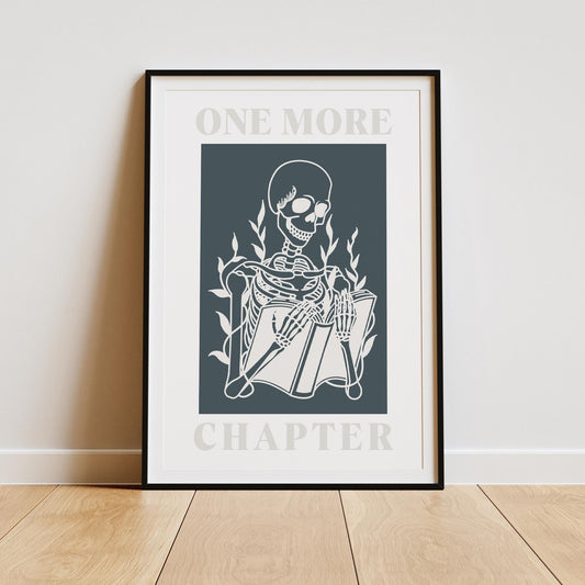 One More Chapter - 04 Poster: Book Quote Print, Skeleton Wall Art, Book Lover Gift, Reading Decor, Cosy Home Decor, Book-Themed Art Print
