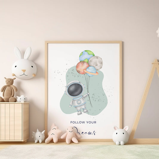 Follow Your Dreams Space Poster: Illustrated Astronaut Print, Kids Poster, Kids room decor, Nursery Poster, Follow Your Dreams Quote