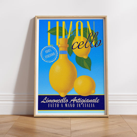Vintage Limoncello Poster | Italian Kitchen Wall Art Print, Amalfi Coast Citrus Home Decor, Retro Blue Bottle Illustration, Summer Aesthetic