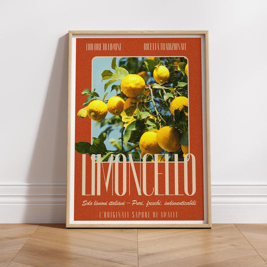 Vintage Limoncello Poster | Italian Lemon Tree Print, Amalfi Coast Citrus Wall Art, Rustic Red Limoncello Kitchen Decor, Summer Aesthetic
