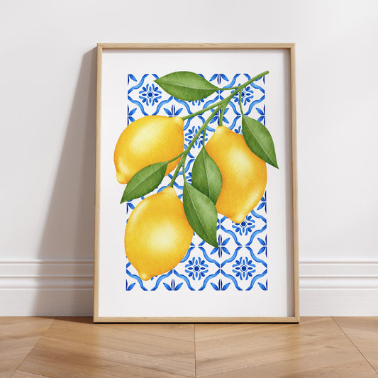 Lemon Wall Art Print | Amalfi Coast Kitchen Decor, Mediterranean Blue Tile Poster, Italian Fruit Illustration, Summer Aesthetic Home Decor