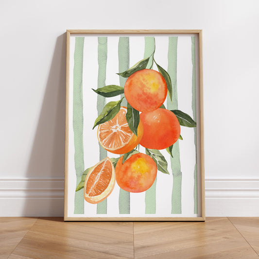 Watercolour Orange Art Print Mediterranean Wall Art, Green Stripes, Fruit Kitchen Poster, Botanical Orange Illustration, Summer Aesthetic