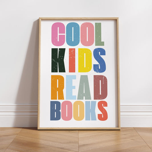 Cool Kids Read Books - Multicolour Poster: Typography Print For Children, Book Lover Quote Wall Art for Reading Corner, Bedrooms & Playroom