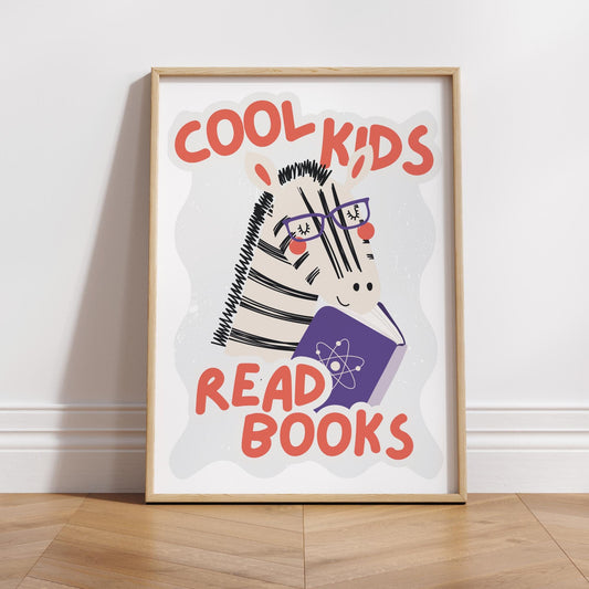 Cool Kids Read Books - Zebra Poster: Typography Print For Children, Book Lover Quote Wall Art for Reading Corner, Bedrooms & Playrooms