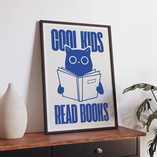 Cool Kids Read Books - Blue Cat Poster: Typography Print For Children, Book Lover Quote Wall Art for Reading Corner, Bedrooms & Playrooms