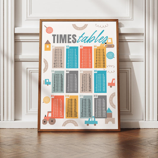 Car-Themed Times Tables Poster: Educational Math Print For Kids, Multiplication Wall Art for Classrooms, Playrooms, or Bedroom Decor