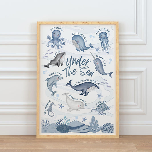 Under The Sea Animal Poster: Watercolor Ocean-Themed Educational Wall Art for Kids, Ocean Animals Print, Sea Theme Home Decor, Nursery