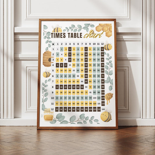 Times Tables Chart Poster - Bee-Themed: Educational Math Print For Kids, Multiplication Wall Art for Classrooms, Playrooms, or Bedroom Decor