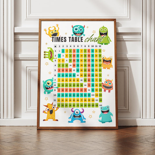 Monster-Themed Times Tables Poster: Educational Math Print For Kids, Multiplication Wall Art for Classrooms, Playroom, Bedroom Decor