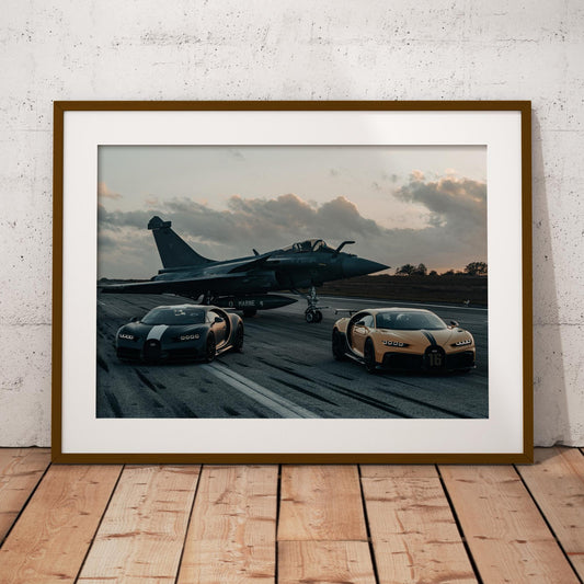 Bugatti Chiron Duo with Fighter Jet Poster: Luxury Supercars Aviation Wall Art, Cool Car Print Gift for Car Lover, Garage & Home Decor