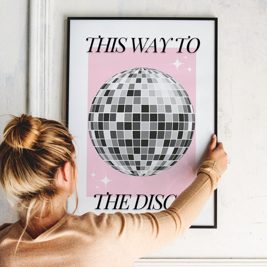 This Way To The Disco Poster: Pink Disco Ball Design Home Decor, Modern Home Decor, Cool Print, Kitchen Decor, Wall Art, Vibrant Poster, Fun