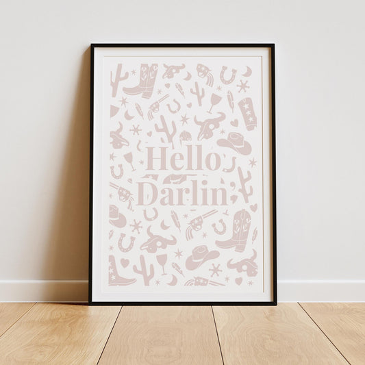 Hello Darlin' - 07 Poster: Western-Themed Print, Rustic Southern Wall Art, Cowboy Aesthetic, Minimalistic Home Decor, Country Living Poster