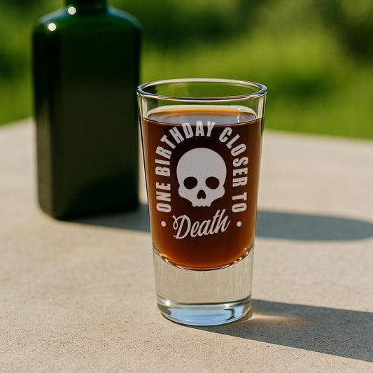 Personalised Birthday Shot Glass | Double-Sided Engraved Shot Glass “One Birthday Closer to Death | Custom Birthday Gift for Him or Her