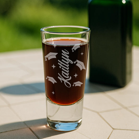 Personalised Graduation Gift | Graduation Caps & Stars | Custom Engraved Name Shot Glass | Graduate Gift Keepsake | Custom Shot Glass